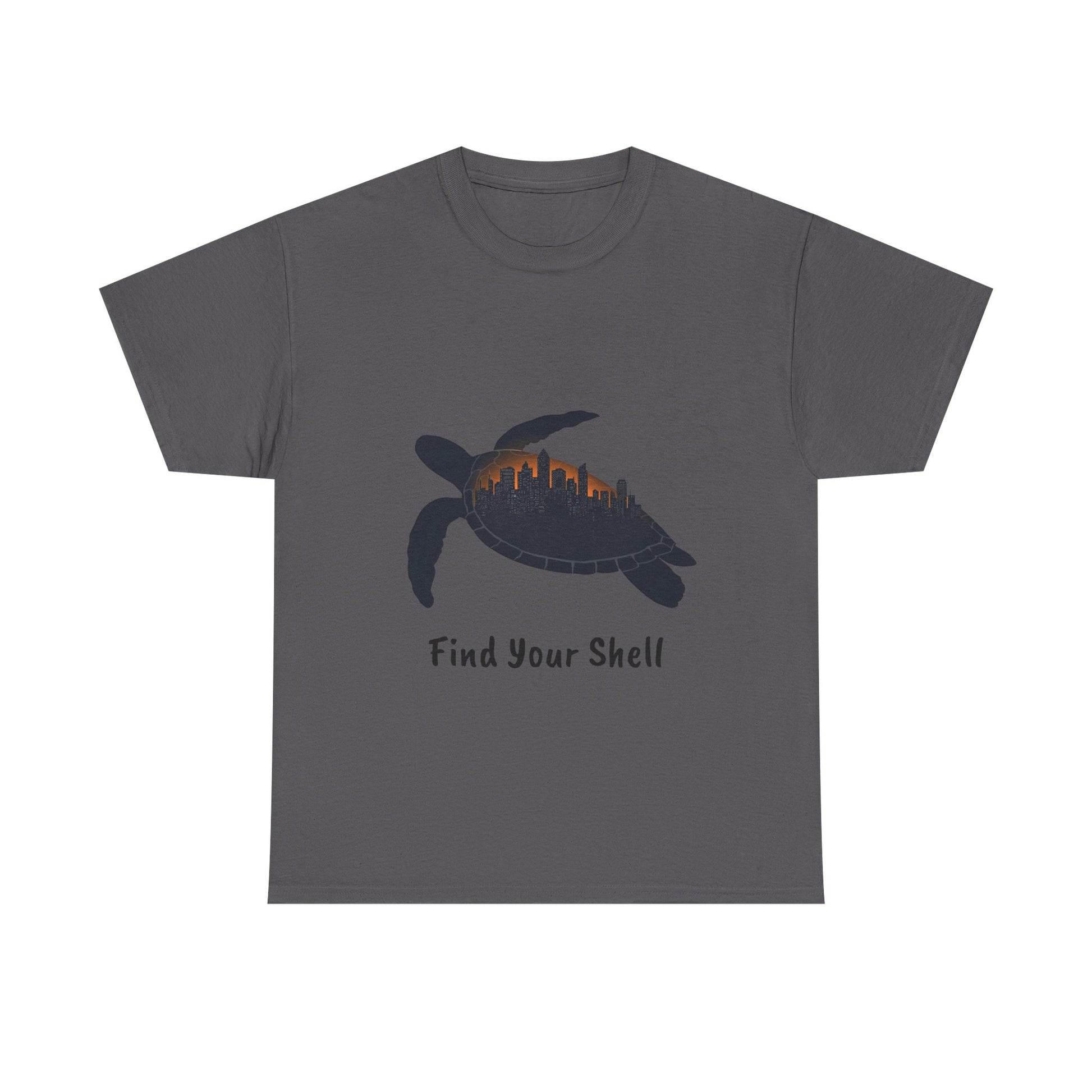 A comfortable and durable T-Shirt featuring a 'Find Your Shell' design with a city skyline and sea turtle motif. Perfect for those who love coastal vibes and beach themes. Ideal for casual wear or as a gift for ocean lovers, city dwellers, and travelers. Suitable for summer outings, beach vacations, Earth Day, World Oceans Day, and coastal-themed events.