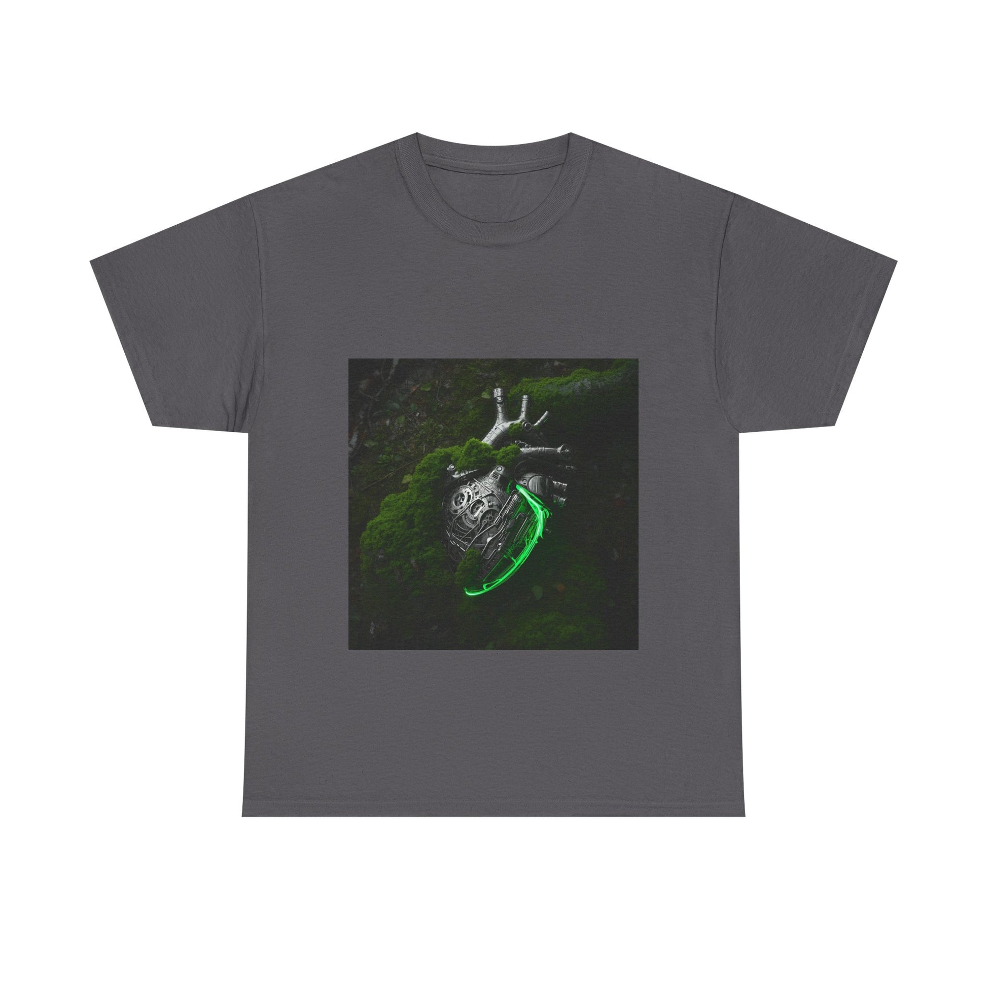 Unisex Glowing Bionic Heart in Moss T-Shirt | Sci-Fi Forest Wear